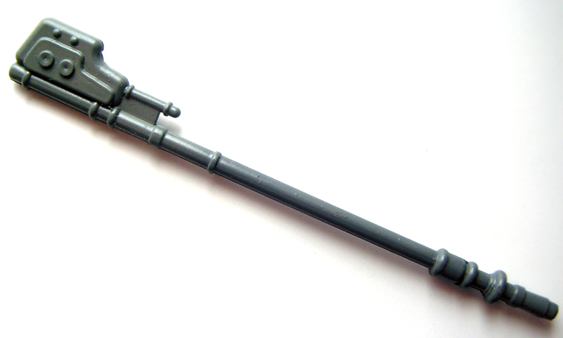 Poor sculpt and lack of detail. Visible flash removal down edges of Staff. Brittle and easily snaps to reveal an Off-White colour on inside. Bubbles visible on parts of the mould.