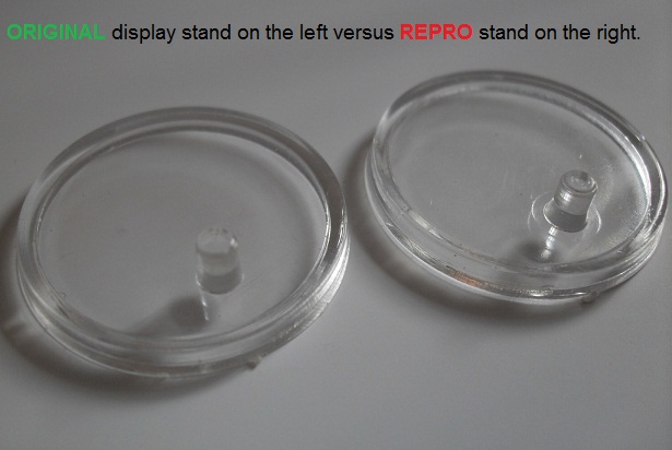 The original round clear display stands were found in the Palitoy and Toltoys Death Star Play-set, and the Darth Vader Star Destroyer Play-set. Below is a comparison picture of the ORIGINAL on the left versus a REPRO on the right. The only way it seems to tell these two apart is by the circle that goes around the foot peg of the repro version.